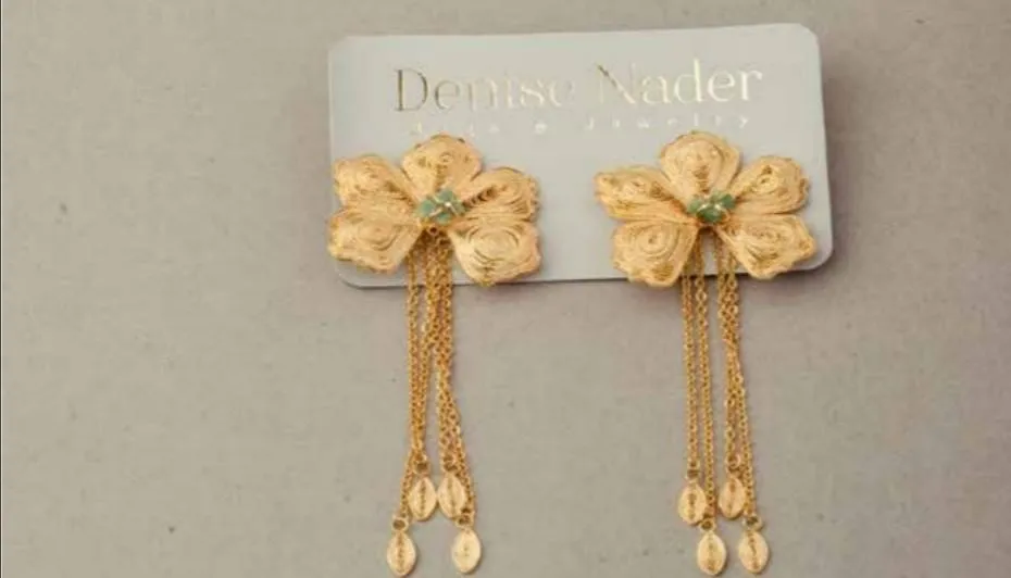 Arete elaborado en la técnica ancestral filigrana,tejido a mano en hilos de bronce con baño de oro de 24 K. Incrustacion de piedras semi preciosas.